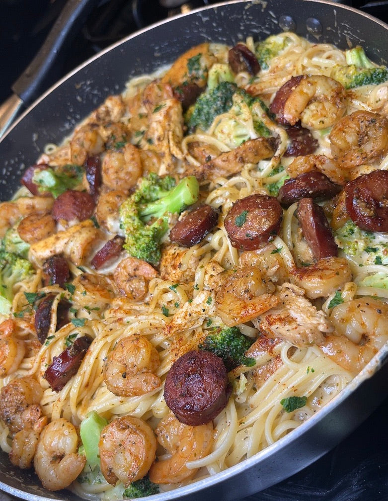 Nae's Chicken, Sausage and Shrimp Alfredo Pasta